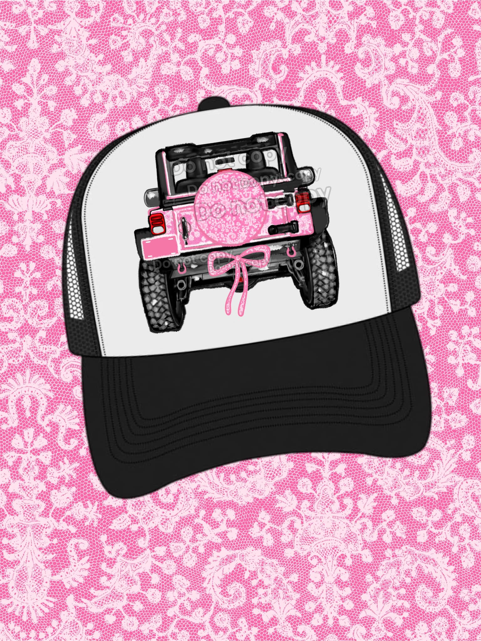 The Jeep with bow features a playful pink print that adds a touch of fun to any outing. Its sturdy design and versatile features make it a reliable choice for all types of terrain. Bring a little personality to your ride with this eye-catching addition. NO BLACK
