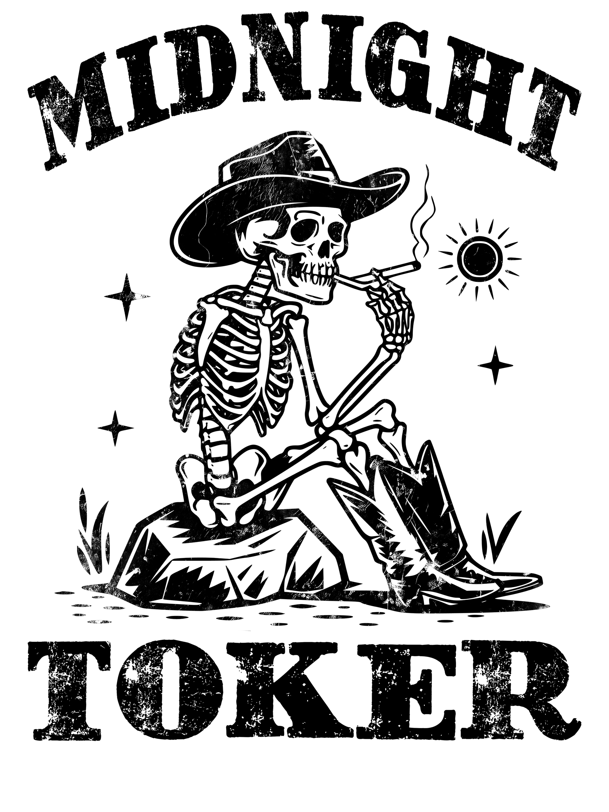 The Midnight Toker print features a striking skeleton wearing a cowboy hat, exhaling smoke in a design that blends rugged western elements with a rebellious edge. This expert-crafted print embodies a bold, nocturnal spirit, perfect for those who appreciate unique, statement-making style with a touch of dark humor and attitude.
